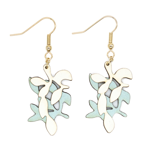 商品名:karupi 'leaves' (古川貴子コラボデザイン) このデザインの出発点になったのは、ピアニスト・古川貴子からの「木漏れ日みたいな」という言葉でした。 木々の葉を抽象化して重ね合わせることで、すき間である木漏れ日を創り出していく。不規則な曲線を自由自在に組み合わせた、紙素材ならではの表現です。「バニラ」と「アクア」の2色を巧みに絡め、耳元に奥行きのある空間を演出しています。 ・内容:イヤリング・ピアス(本体素材:紙) ・本体サイズ:縦約3.5cm ◆「karupi music」は、若手の演奏家とkarupiデザイナーのコラボから生まれたアクセサリー・ラインナップです。 デザイナー:大谷麻弥 コラボモデル:古川貴子(ピアニスト:東京藝術大学卒業・フォルクヴァンク芸術大学修士課程修了・ミュンスター音楽大学国家演奏家資格課程修了)