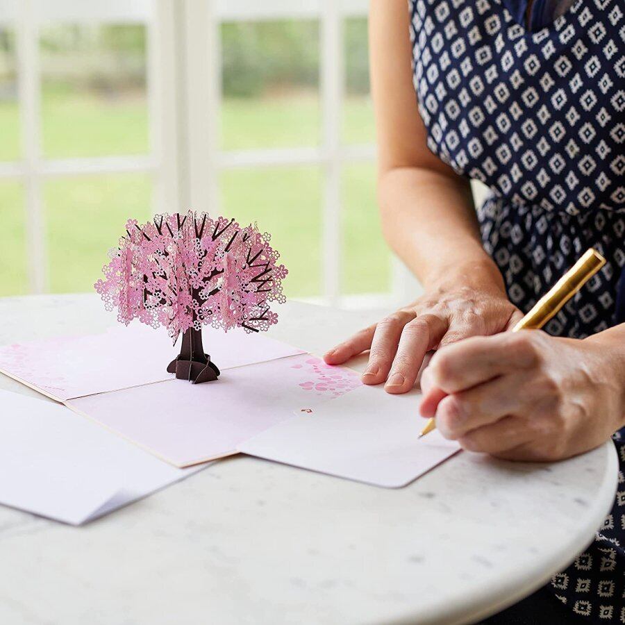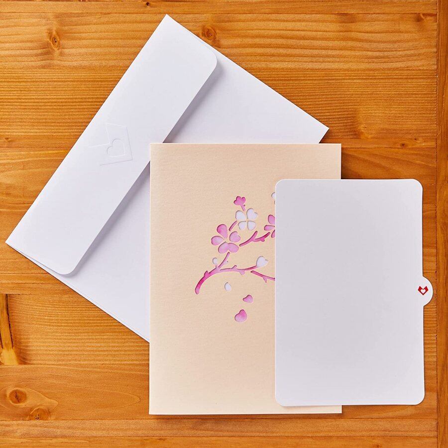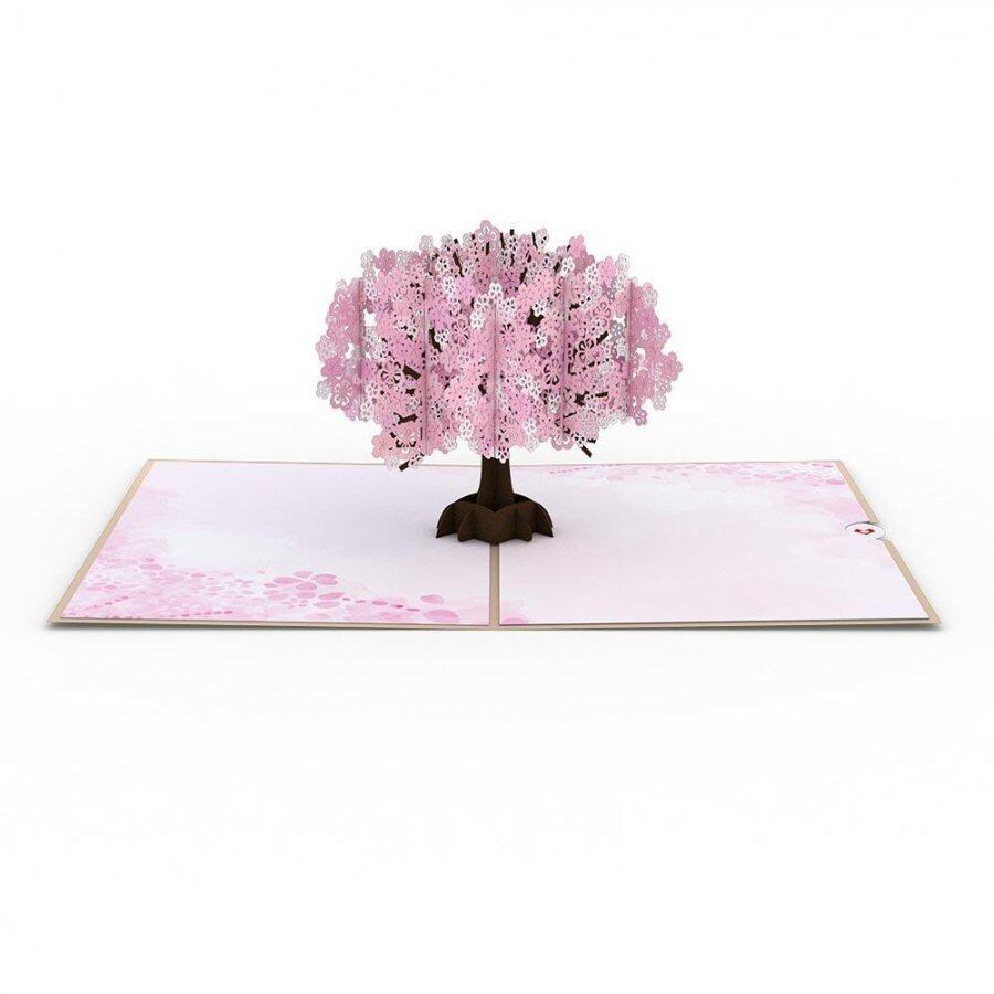カードを開くと、美しいピンクの花びらが溢れんばかりの桜の木、そして、その美しい花びらが舞い広がる情景が目の前に登場します。花びらの形を細部に至るまで精巧に表現し、そのリアリティある花びらたちの隙間から枝を僅かに垣間見せることで、サクラの満開具合をより強調しております。